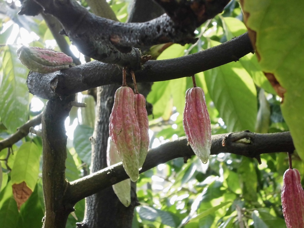 カカオ 結実中(ドーム) ガイドブックNo.43 中央アメリカから南アメリカの熱帯地域原産 アオイ科の常緑樹 別名 カカオノキ ココアノキ ココアやチョコレートの原料になる。 ここから?というようなところから、実がなっています。