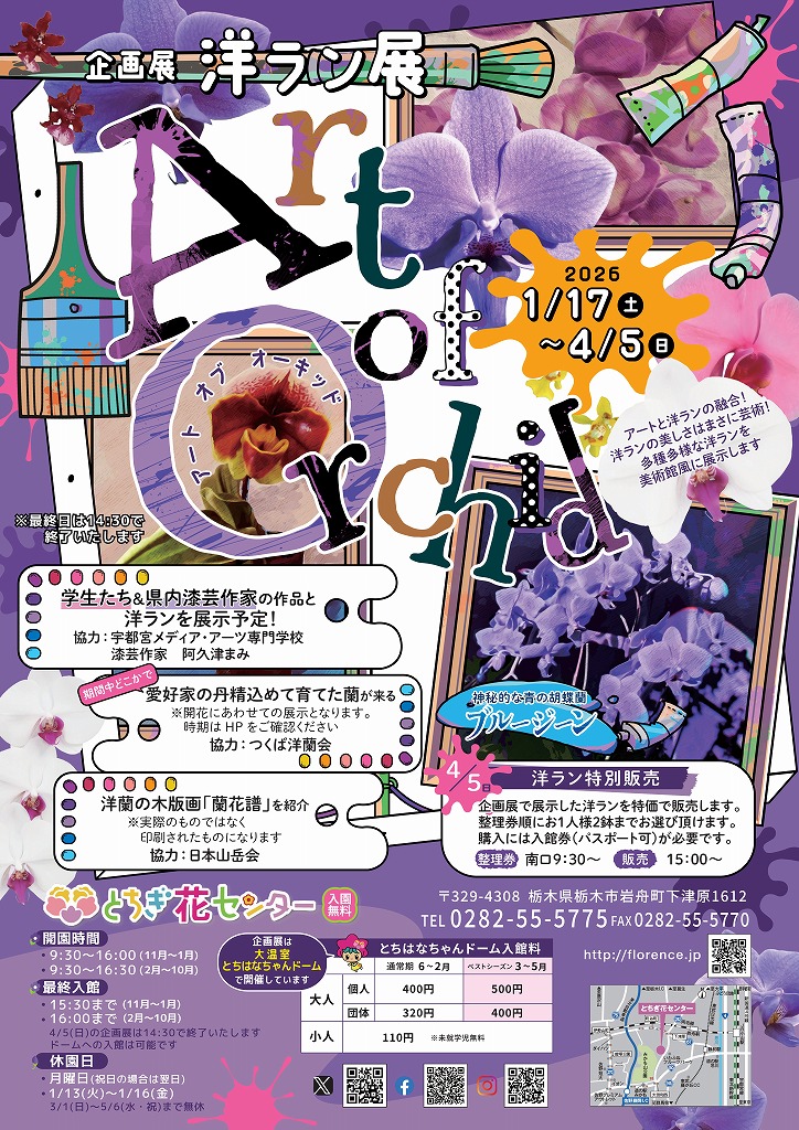 2026年1月3日 - 2026年3月29日 09:30 - 16:00 第2企画展「第6回とちぎ花センターフォトコンテスト」 2026年1月17日 - 2026年4月5日 09:30 - 16:00 企画展「洋ラン展 Art of Orchid アート オブ オーキッド」 2026年1月31日 10:30 - 14:30 草木染 蘇芳