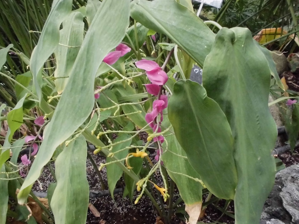 ショウガに似た草姿の多年草で、花は茎の先に穂状に垂れ下がって咲き、