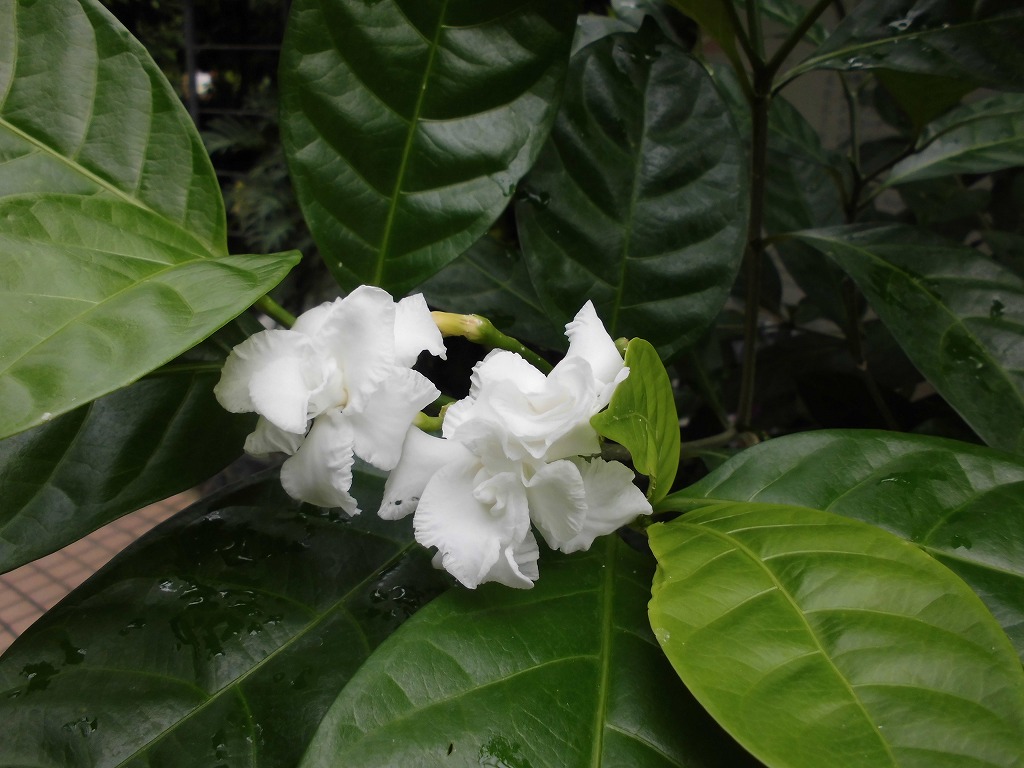 インド原産のキョウチクトウ科サンユウカ属の常緑中木で、自生地では2~3mほどになるようです。花径は3~4cm程度です。夜から明け方にかけて、良い香りを漂わせます。サンユウカの花の咲き方には特徴があって、葉と葉の間から花芽がでてきます。