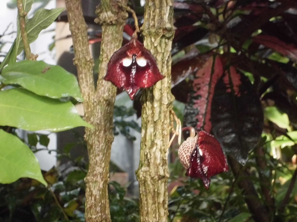 地面に沿って花茎が伸び、濃い赤褐色の「ダースベーダー」のマスクのような花(萼)を1つずつ咲かせます。