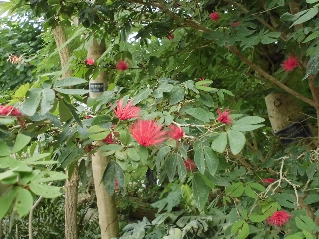 ドームに咲く赤いポンポン!カリアンドラが満開です。同種の<オオベニゴウガン>よりも小さい花ですが花数が多く、一つ一つが真っ赤な綿毛のようでかわいらしいです。可愛らしいポンポンは<パウダーパフ>という別名があります。