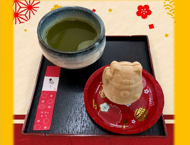〇はなカフェでは「招き猫の福ふく最中お茶セット」を限定30食450円で提供します。