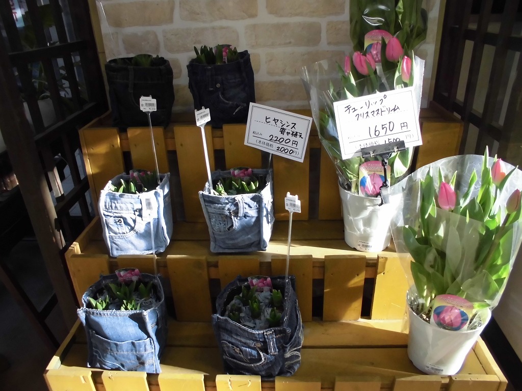 ヒヤシンス寄せ植え ジーンズの鉢カバー